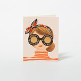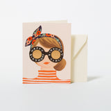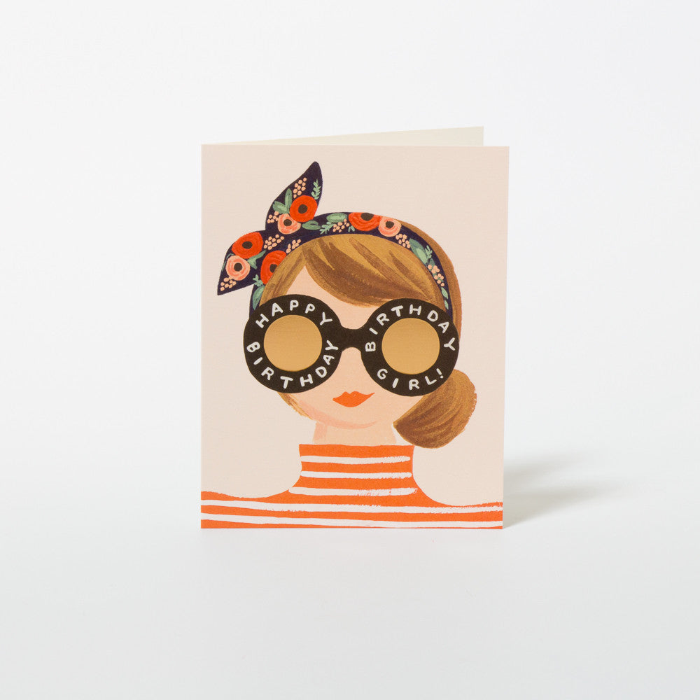 Geburtstagskarte mit liebevoller Illustration einer jungen Dame in Ringelshirt mit Haarband und kupfer-verspiegelter Sonnenbrille. Die Brille ist rund und trägt den Schriftzug "Happy Birthday Birthday Girl". Ein sehr charmanter Überbringer Ihrer Glückwünsche zum Geburtstag!