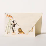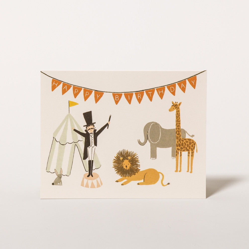 Geburtstagskarte mit Zirkusmotiv. Der Zirkusdirektor steht vor einem kleinen gestreiften Zelt und dirigiert Löwe, Giraffe und Elefant. Darüber hängen rote Fähnchen, auf denen "Happy Birthday" steht und überbringen Ihre Glückwünsche zum Geburtstag.