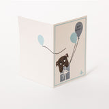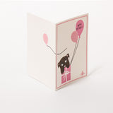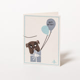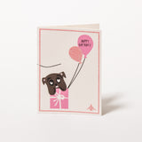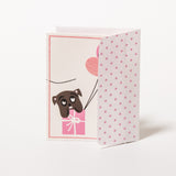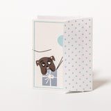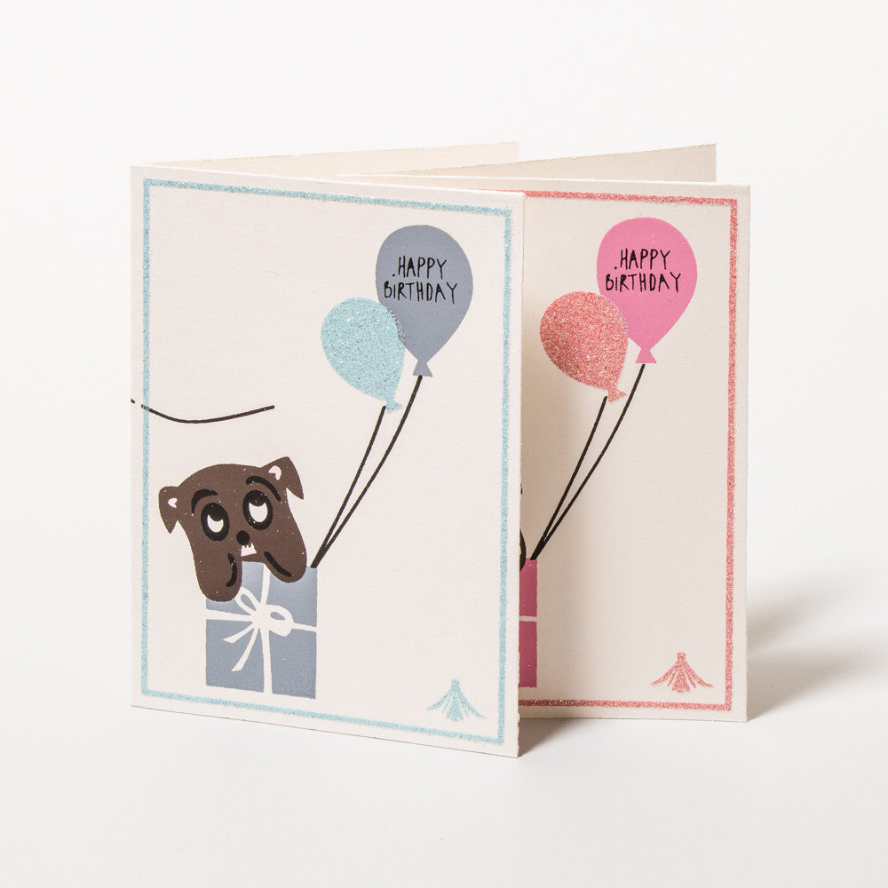 Handgedruckte Grußkarte mit Glitzerelementen. Die Vorderseite schmückt ein Hündchen mit Geschenk und "Happy Birthday"-Luftballon. Das Papier der Karte ist leicht cremefarben und der passende Umschlag ist weiß. Erhältlich in Pink und Türkis. Die Umschlaglasche hat dementsprechend ein passendes rosafarbenes beziehungsweise türkises Pünktchenmuster.