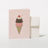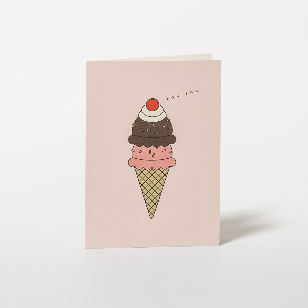 Grußkarte mit stilisierter Eistüte und dem Schriftzug "for you". Natürlich fehlen Streusel, Sahnehäubchen und Kirsche nicht! Die Karte ist außen leicht rosa getönt. Das Papier ist, ebenso wie der passende Umschlag, leicht cremefarben.