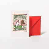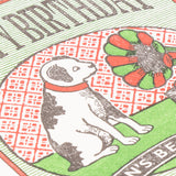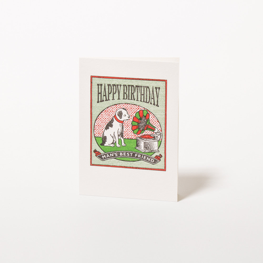 Aufwändig gedruckte Grußkarte zum Geburtstag. Die Vorderseite ziert ein Hund, der in ein Grammophon hört. Durch den Buchdruck ist ein leichtes Relief fühlbar. Der passende Umschlag ist rot.