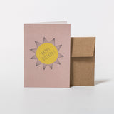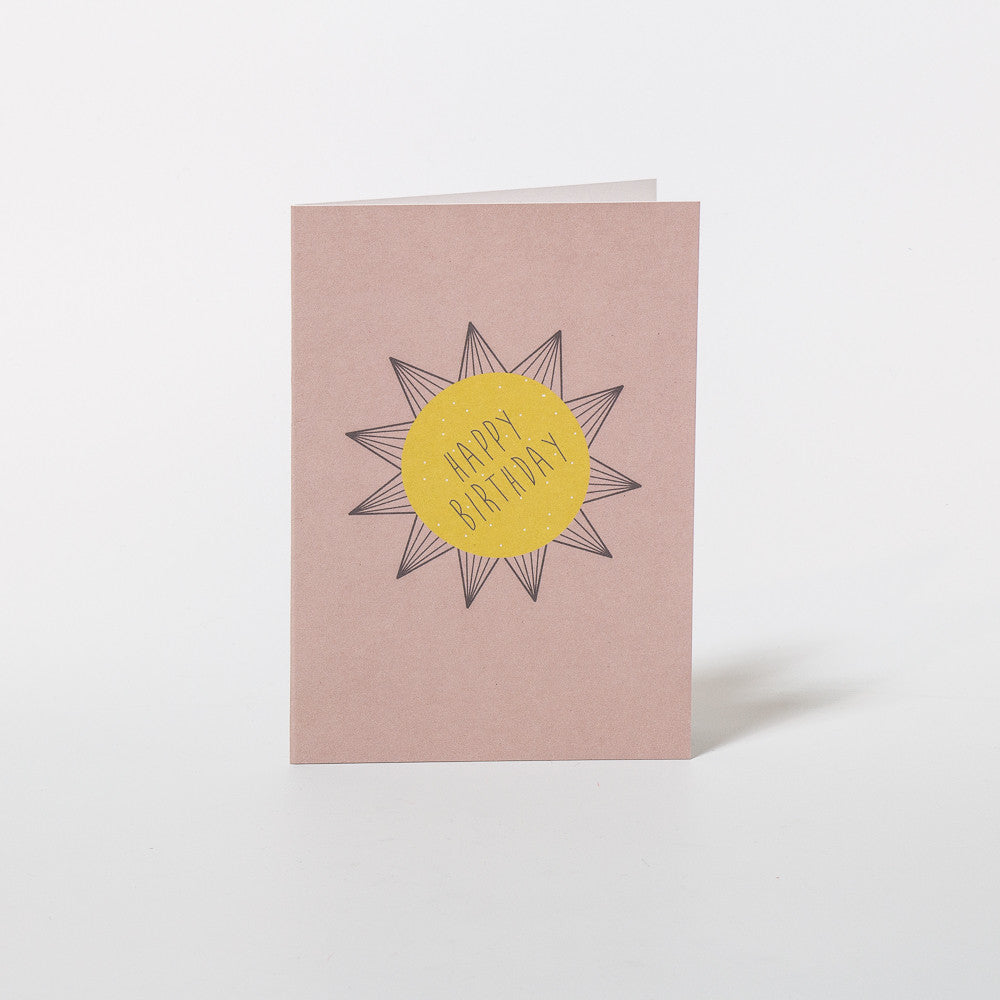 Geburtstagskarte mit Sonnen-Motiv und dem Schriftzug "Happy Birthday". Die Grußkarte ist vorne und hinten in einem schönen, matten Altrosa getönt. Auf der Vorderseite überbringt eine stilisierte gelbe Sonne mit "Happy Birthday" Ihre Glückwünsche zum Geburtstag. Durch ihr reduziertes und neutrales Design ist die Geburtstagskarte für Damen wie Herren gleichermaßen geeignet.