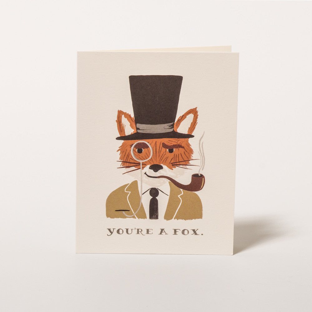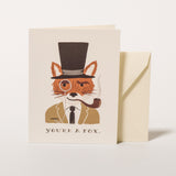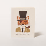 Aufmunternde Grußkarte mit dem Schriftzug "You're a Fox". Übersetzt heißt das soviel wie "Du bist ein Fuchs" – perfekt, wenn Sie Ihre Anerkennung mit einem Augenzwinkern ausdrücken möchten. Auf der Vorderseite der Grußkarte ist ein Fuchs im Anzug mit Hut, Monokel und Pfeife zu sehen.