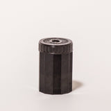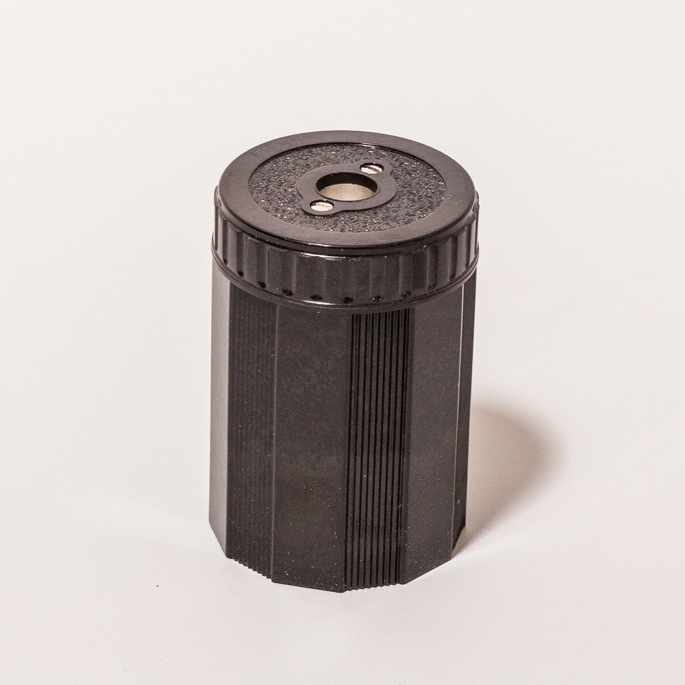 Klassischer Dosenspitzer aus schwarzem Bakelit, der in dieser Form seit 1936 hergestellt wird. Der Spitzereinsatz für Bleistifte und Buntstifte ist an den Deckel des Gehäuses geschraubt. Der Deckel ist mit einem Schraubverschluss an der Auffangdose angebracht.