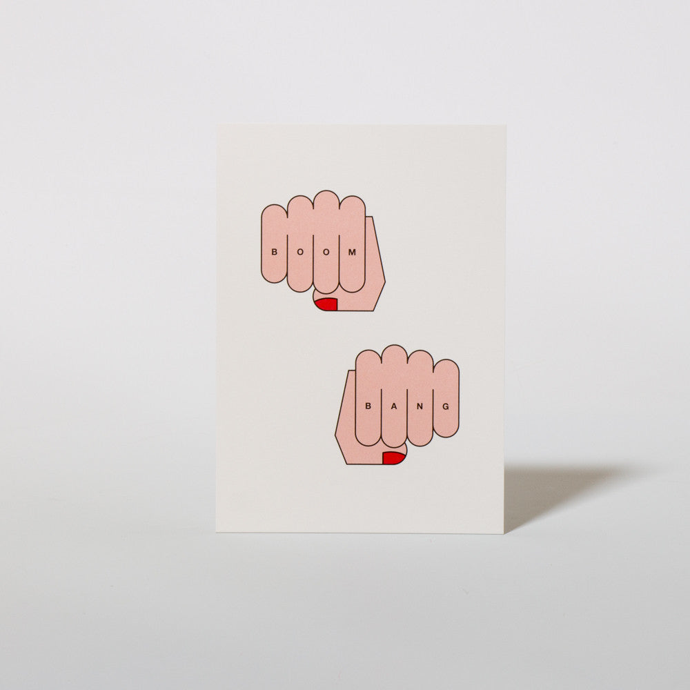 Boom! ist das nicht eine coole Postkarte! Auf der Vorderseite sind zwei Frauenhände zu sehen, zur Faust geballt. Auf die Finger – die übrigens mit rotem Nagellack geschmückt sind – ist "Boom Bang" tätowiert. Daniela Rosenhammer, Grafikerin und Artdirektorin aus Regensburg, hat die Postkarte in der für sie typischen, comicartigen Manier gestaltet. Ob Sie nun jemandem Ihre Anerkennung oder Ihren Support ausdrücken möchten – mit dieser Postkarte sind Sie up-to-date.