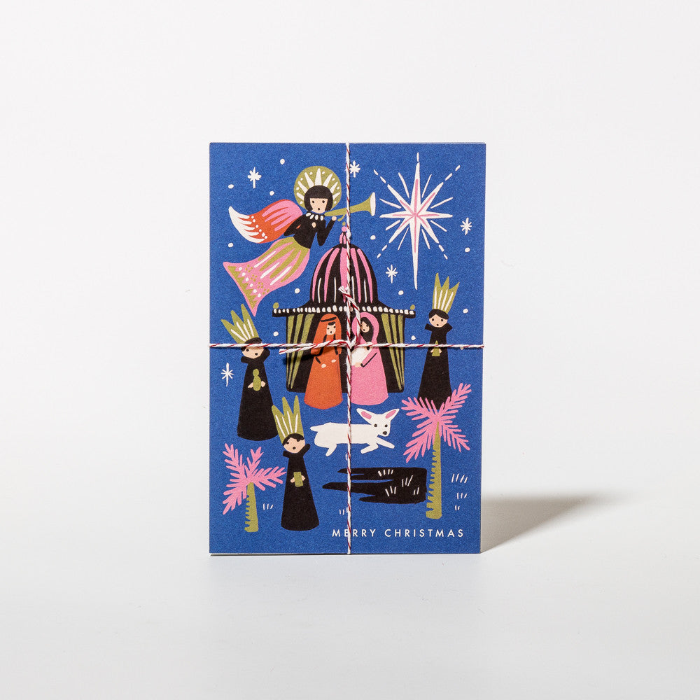 Weihnachtliches Postkarten-Set mit Krippenszene und dem Schriftzug "Merry Christmas". Die liebevolle Illustration der amerikanischen Grafikerin Anna Bond auf der Vorderseite der Postkarte bringt Sie automatisch in Weihnachtsstimmung: Da sind Maria, Joseph und das Jesuskind zu sehen, ein Schäfchen, die heiligen drei Könige und ein Engel. Das alles eingebettet in eine friedliche orientalische Szenerie mit Krippe und Palmen, darüber leuchtet der Weihnachtsstern. Der Hintergrund der Postkarten ist blau, das Motiv ist in Rot- und Pink-Tönen gehalten, ergänzt von Gold und Schwarz. Eine sehr charmante Art, Ihre Weihnachts-Grüße zu versenden!