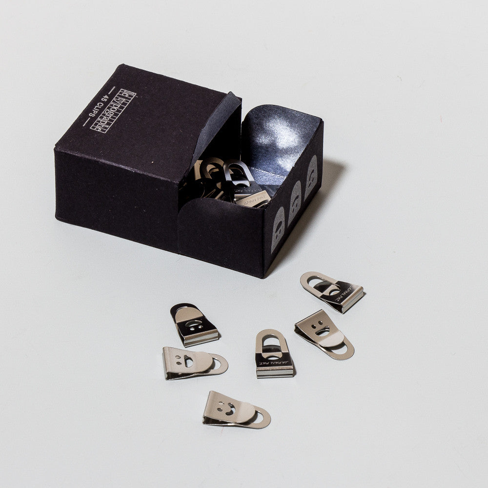 Die Packung Clips von Le Typographe ist aus stabilem, dunkelblauem Papier, das innen irisierend ist, und lässt sich ganz einfach wiederverschließen. Jede Packung enthält 45 Metall-Clips mit drei unterschiedlichen Smiley-Motiven.