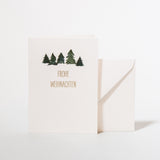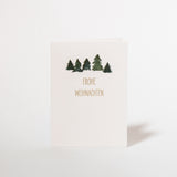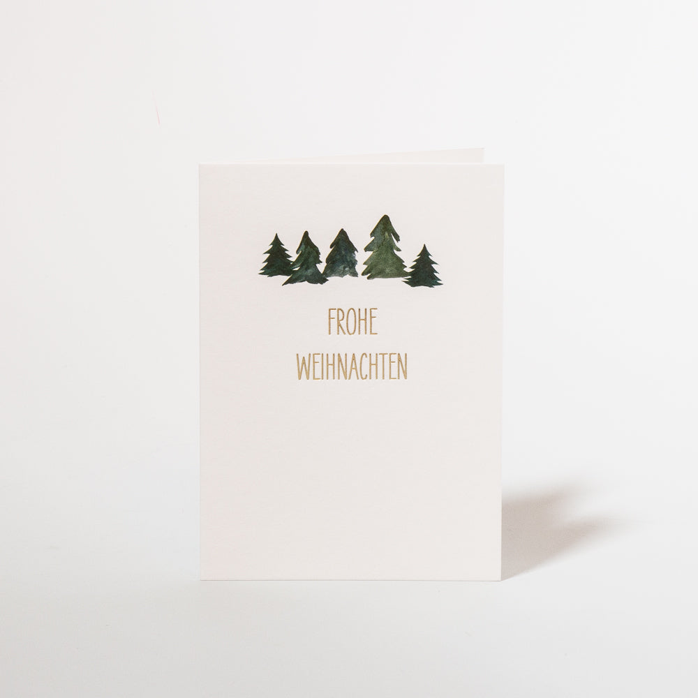 Wunderschöne Weihnachtskarte von Gmund. Mit dieser Weihnachtskarte entführen wir sie direkt in die Weihnachtszeit, in einen saftigen, dunkelgrünen Tannenwald, der Boden ist von Schnee bedeckt. Unter den Bäumen steht der Schriftzug "Frohe Weihnachten" in goldenen Großbuchstaben. Das Papier lässt die weiche Oberfläche des Schnees direkt sichtbar werden. Mit dieser Weihnachtskarte versenden Sie warme, weihnachtliche Atmosphäre, ohne kitschig zu sein. Für Damen wie Herren, jung und alt gleichermaßen geeignet.